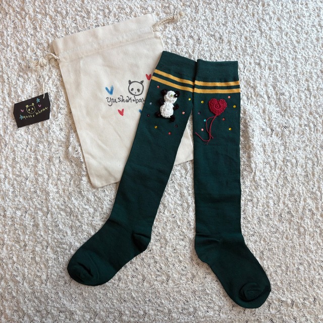 レディースサイズのハイソックス 手編みのモチーフが愛らしいアイテム 巾着付きです♪ ブランド:yushokobayashi
