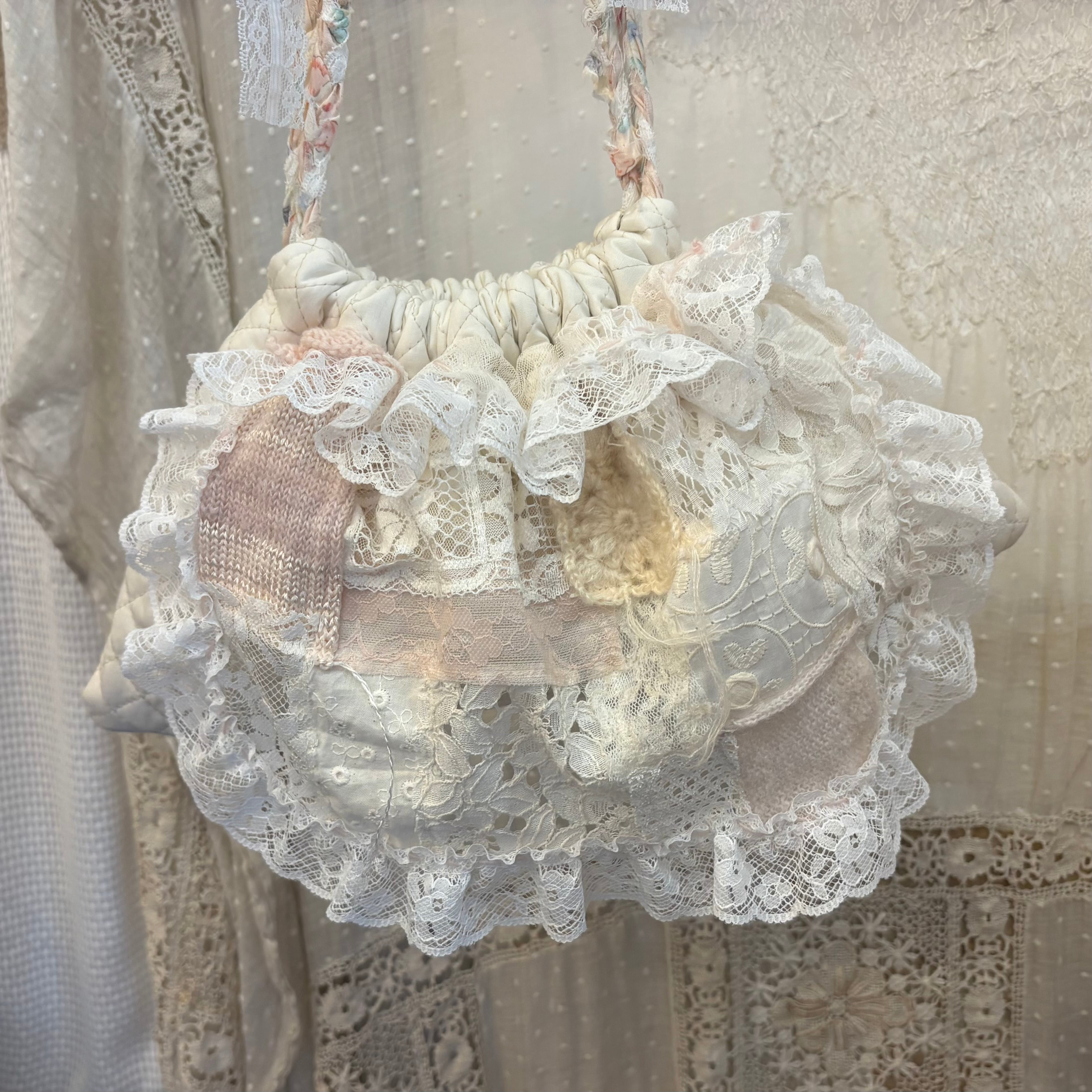 ハンドニットやレースなど組み合わせられたパッチワークのモチーフがあしらわれています。