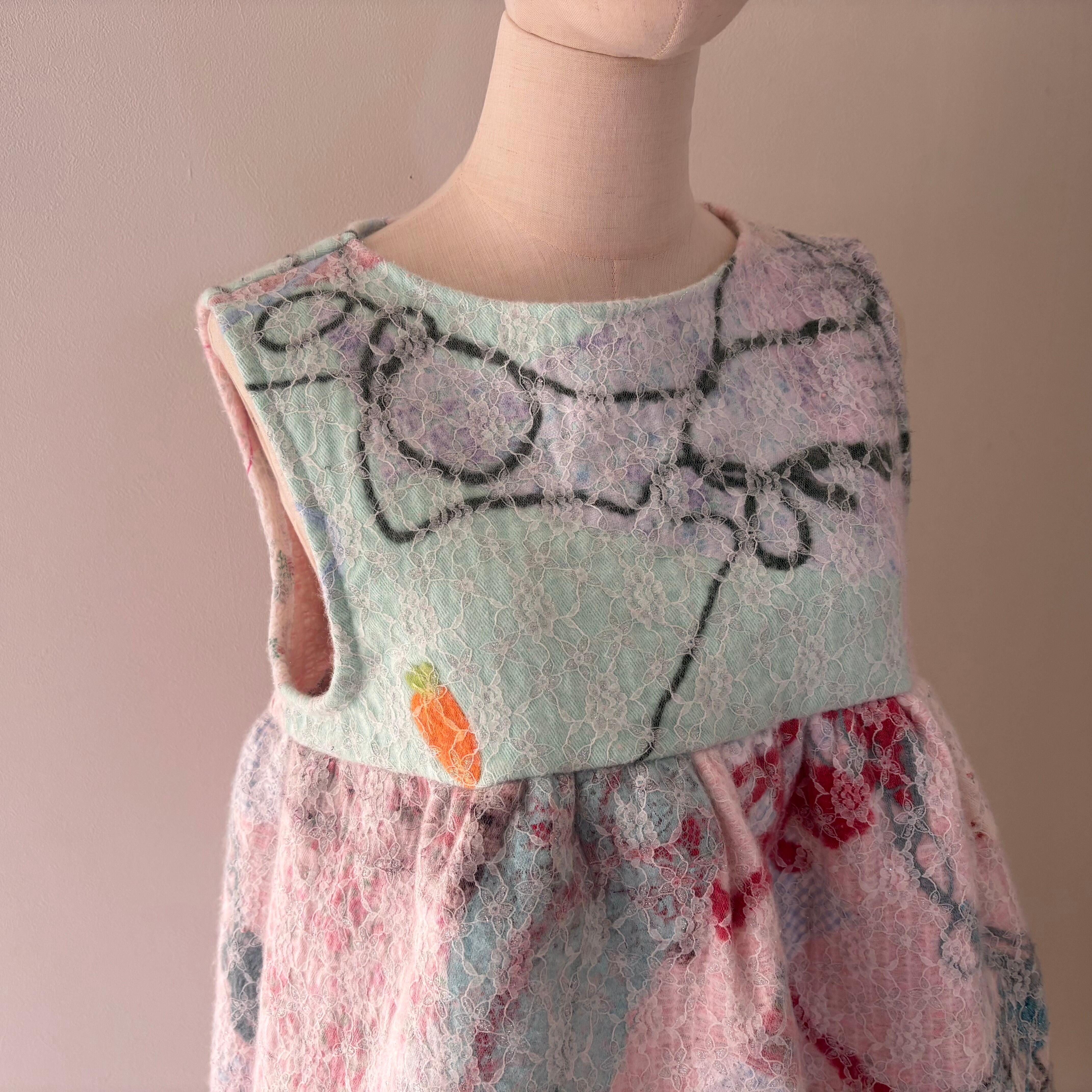 毛糸やリボン、とじこみが制作したにんじんモチーフなど様々なパーツがレースにとじこめられています!