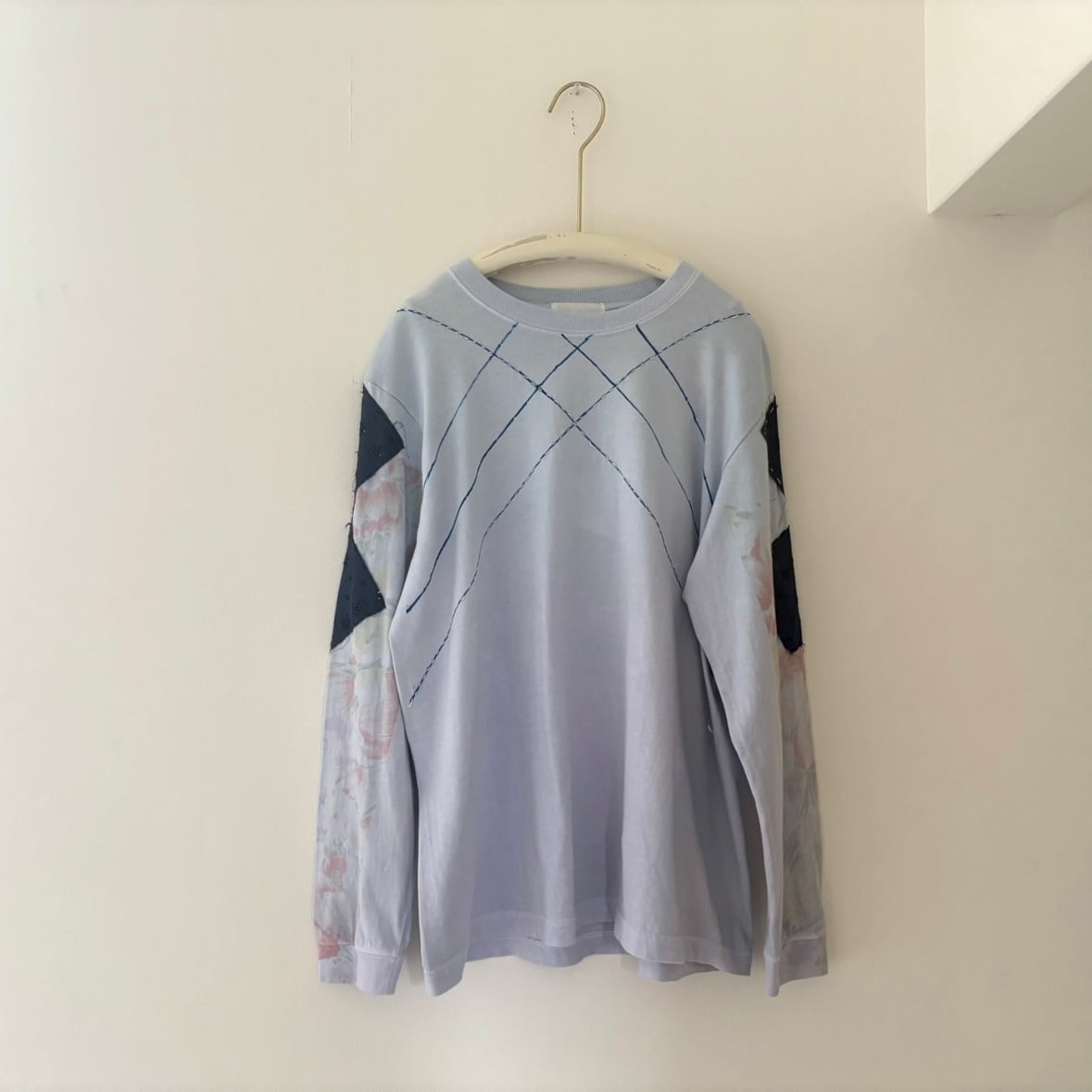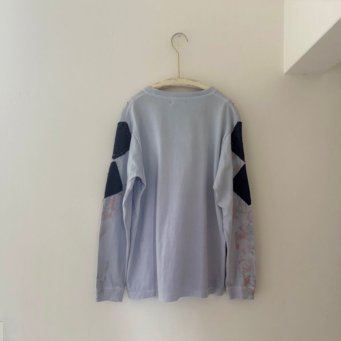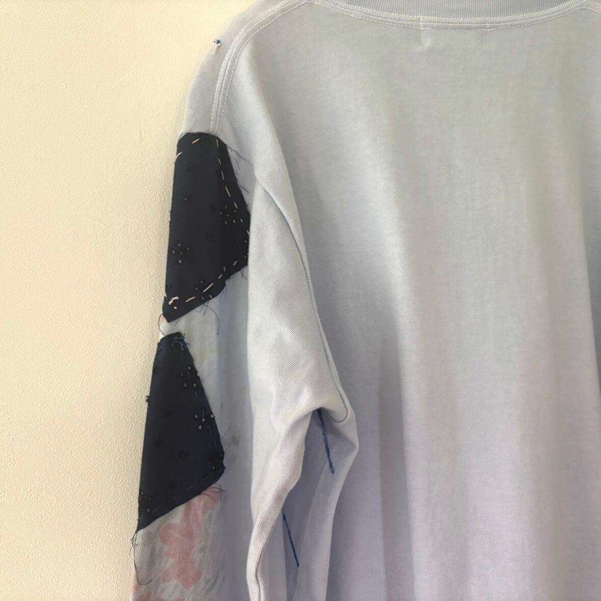プリント、染め、パッチワークが施されたロンT
