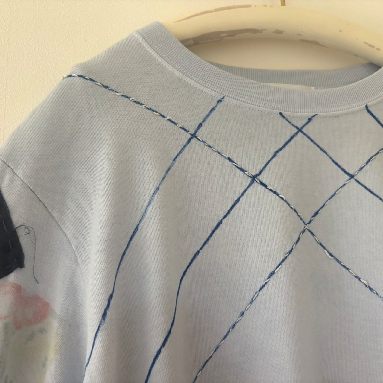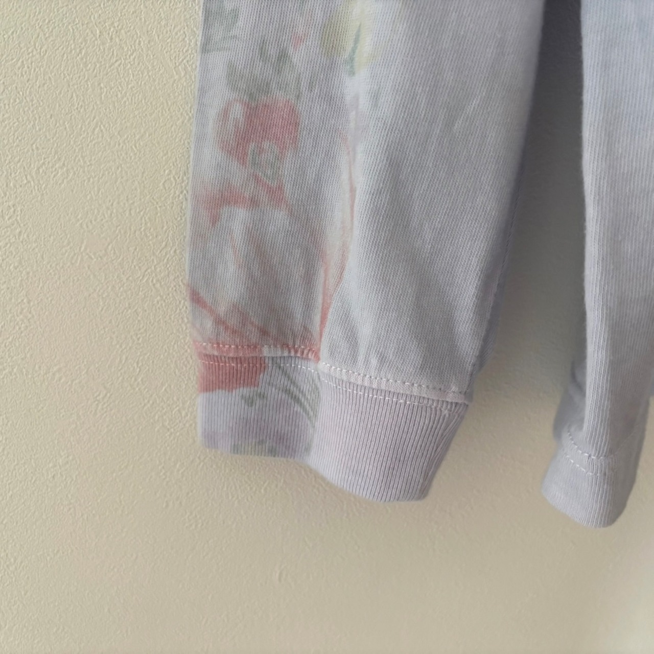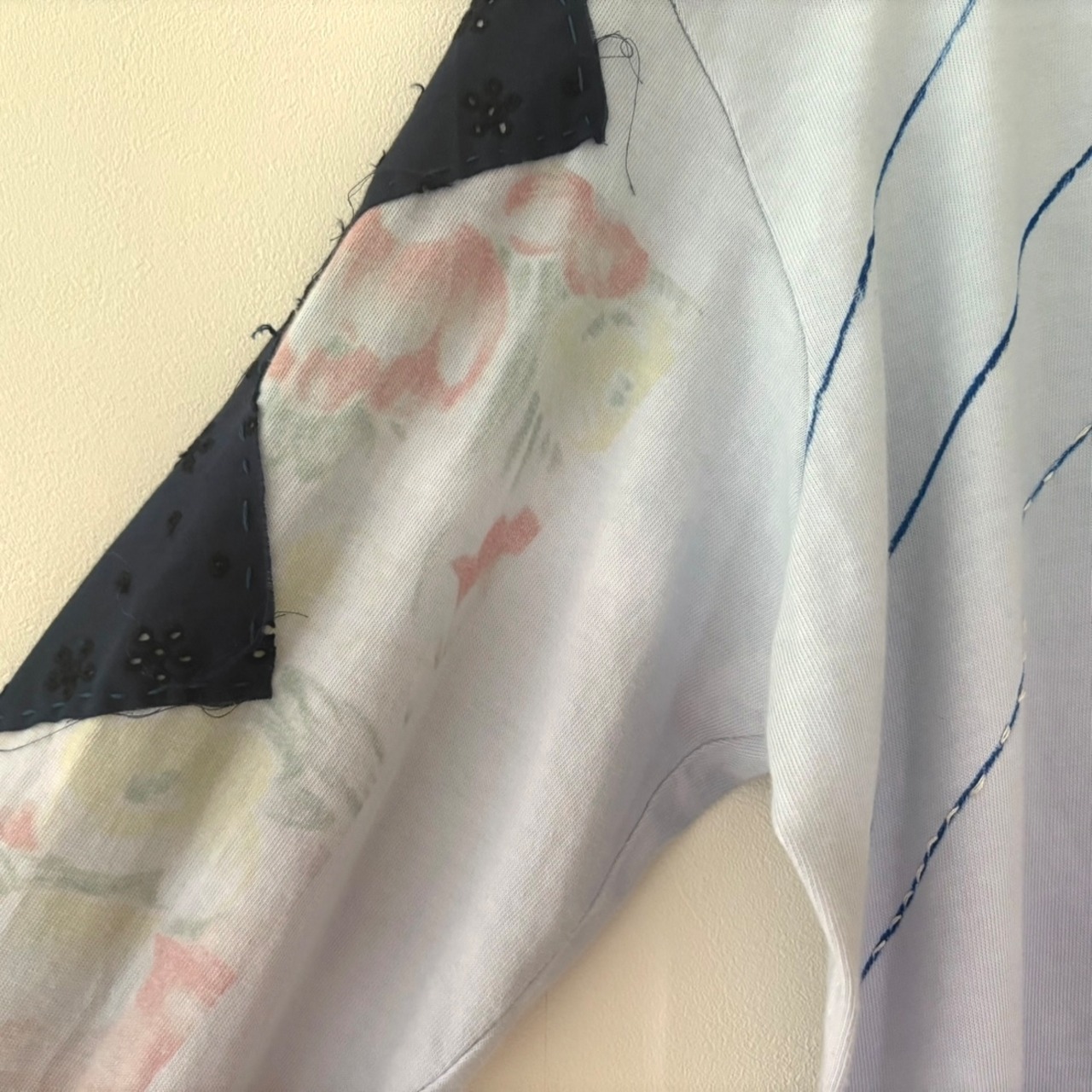プリント、染め、パッチワークが施されたロンT